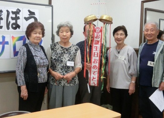 8月(毎年休会月)生まれの中村さん、10月生れの白石さんと木下さん、併せて3名の誕生日を祝いました。くす玉を弾き割ったあと、ハッピーバースデイの歌(一人ずつ)を歌い、ささやかな記念品を贈呈し、祝福しました。