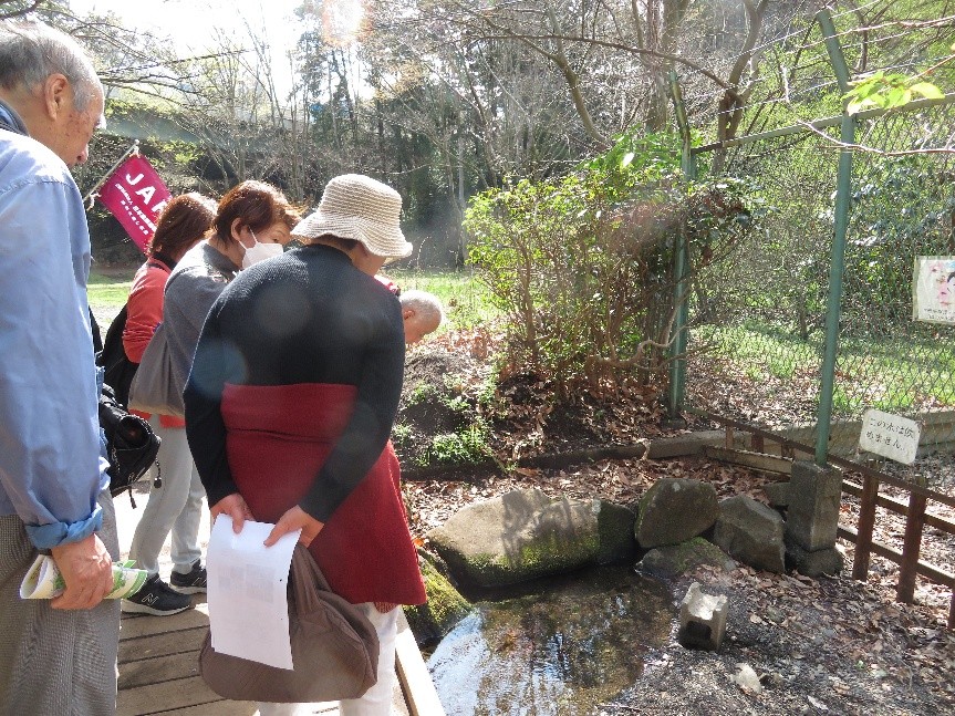 約1.5kmで公園入り口の園名石前に着。ここで「泉の森園内地図」を配布しコースの概略説明後2級河川引地川の水源を確認して道路246下を経由、売店前で小休止。