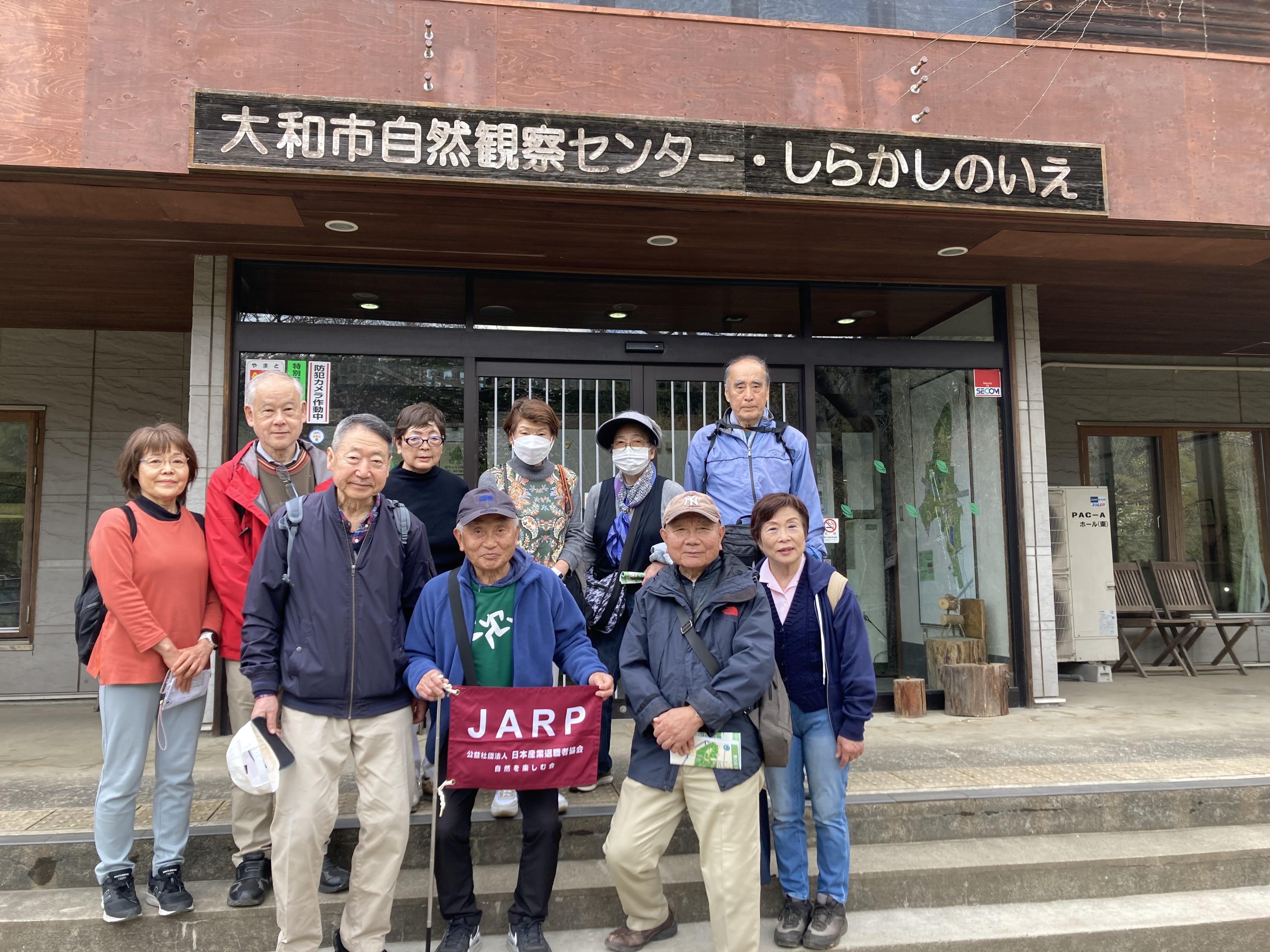 水車小屋を経由して自然観察センター・しらかしのいえへ着。展示小魚・鳥・蛇等の他公園資料を見て、館入り口で集合写真を撮る。